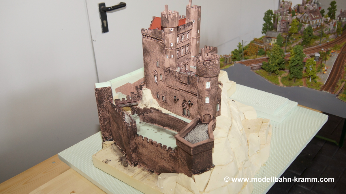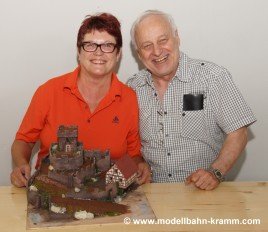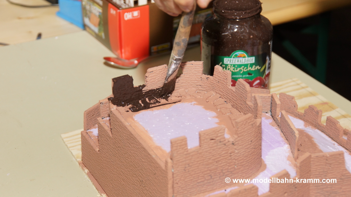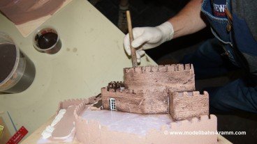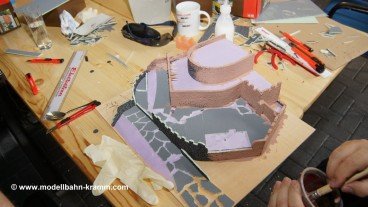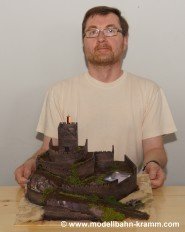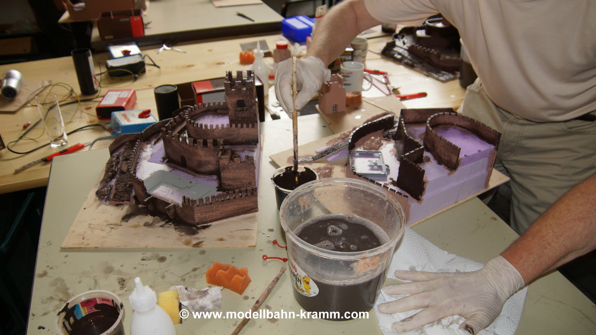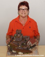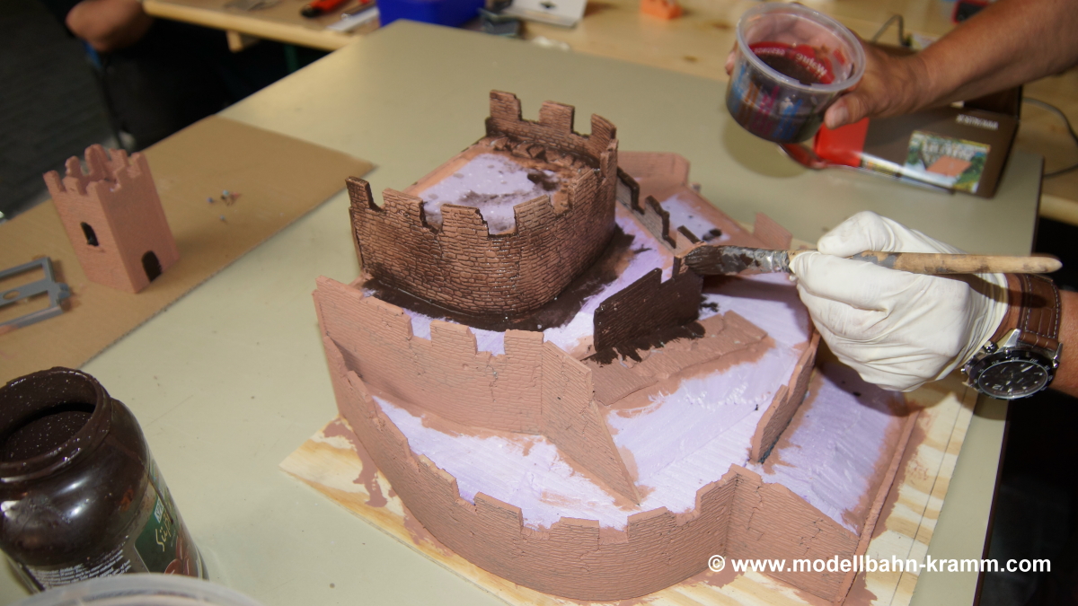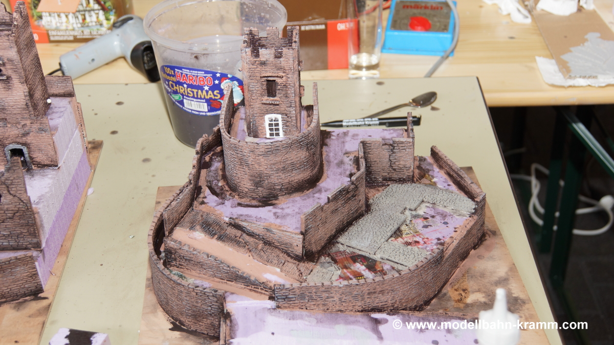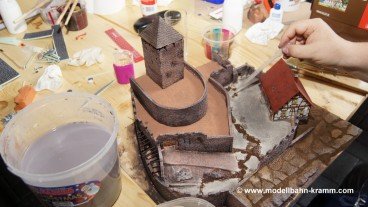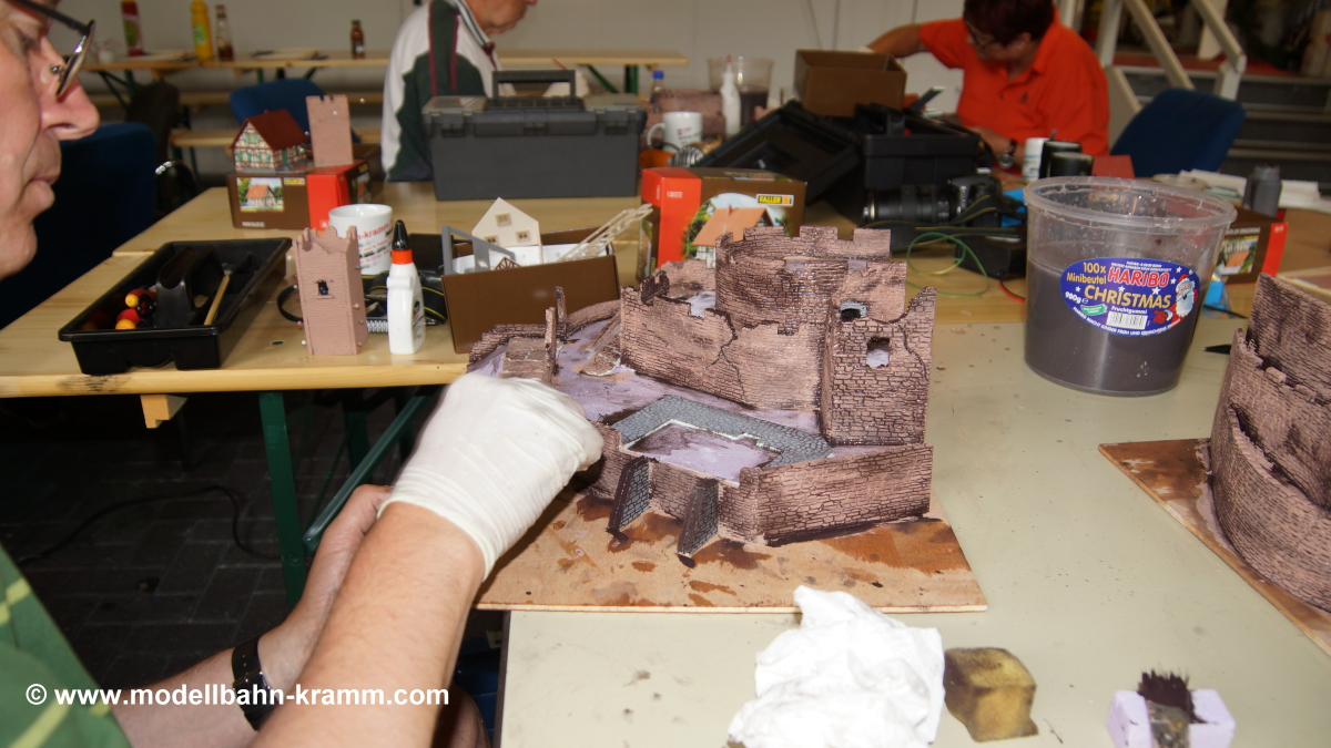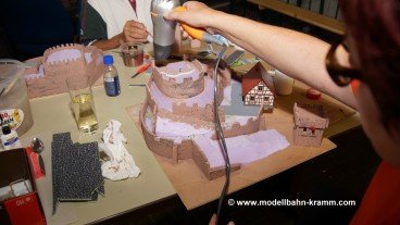 Das Vorgabe war klar, die Umsetzung wurde von jedem Teilnehmer individuell ausgeführt, und zum Schluß sahen wir verschiedene Varianten, die aber alle das gleiche Thema zeigten: "Burgruine mit Fachwerkhaus".