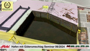 Auf dem vorgefertigten Styrodurrohling wird zunächst das Hafenbecken mit Kaimauer und Spundwand und dem Gewässergrund (Wellenstruktur, Farbgebung) gestaltet. Es folgt der Bau der Gleisanlage inclusive Schienen für den Portalkran und der Aufbau der gepflasterten/ betonierten Flächen. Sie bekommen gezeigt, wie der gesamte Bereich der Hafenanlage mit ordentlich industrieller Verschmutzung nach und nach gealtert wird.